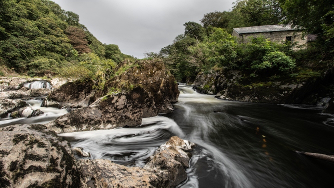 Located at Carmarthenshire’s western border, the charming village of Cenarth is home to the picturesque Cenarth Falls, a series of small waterfalls on the River Teifi. This unique spot sits where Carmarthenshire meets Ceredigion and Pembrokeshire. Overlooking the falls is the National Coracle Centre, celebrating the traditional woven boats once used here for fishing sea trout. A peaceful walk starts at the 18th-century Cenarth Bridge, following an elevated wooden path along the river and through woodland. Visitors often hope to see the famous salmon leaping up the falls on their journey to spawn—a truly special natural spectacle.